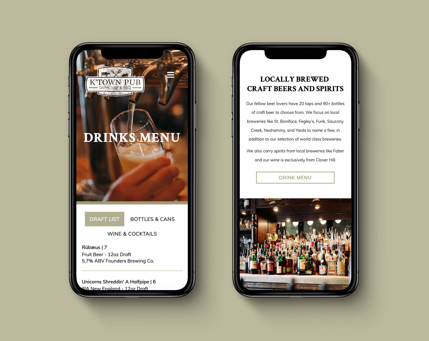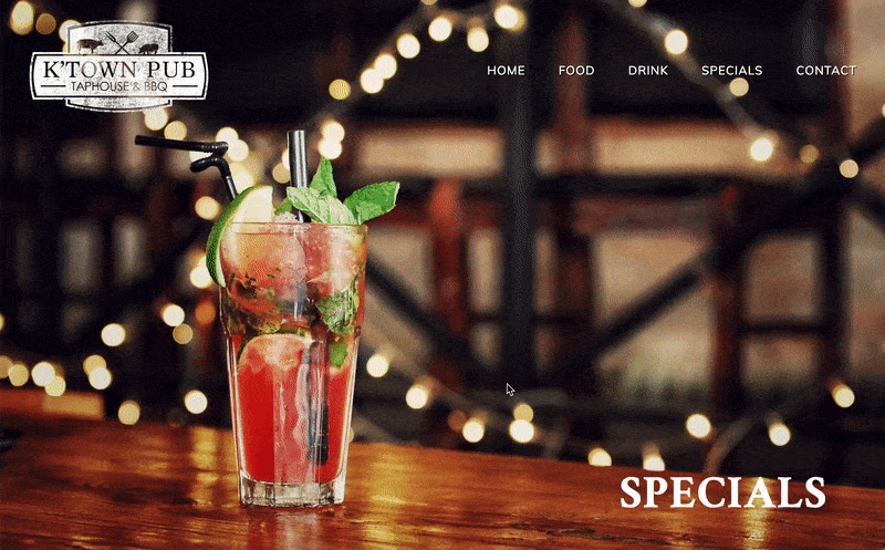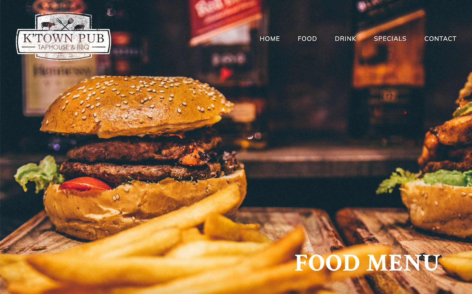 The K'Town Pub is a rustic, hometown pub serving delicious and authentic southern-style BBQ. This website redesign focused on highlighting the process and recipes of scratch-made BBQ through the design. Using mouth-watering food photography and images that capture the charm and atmosphere of the pub, this new site puts all the focus on its content. The site was custom coded for Wordpress.